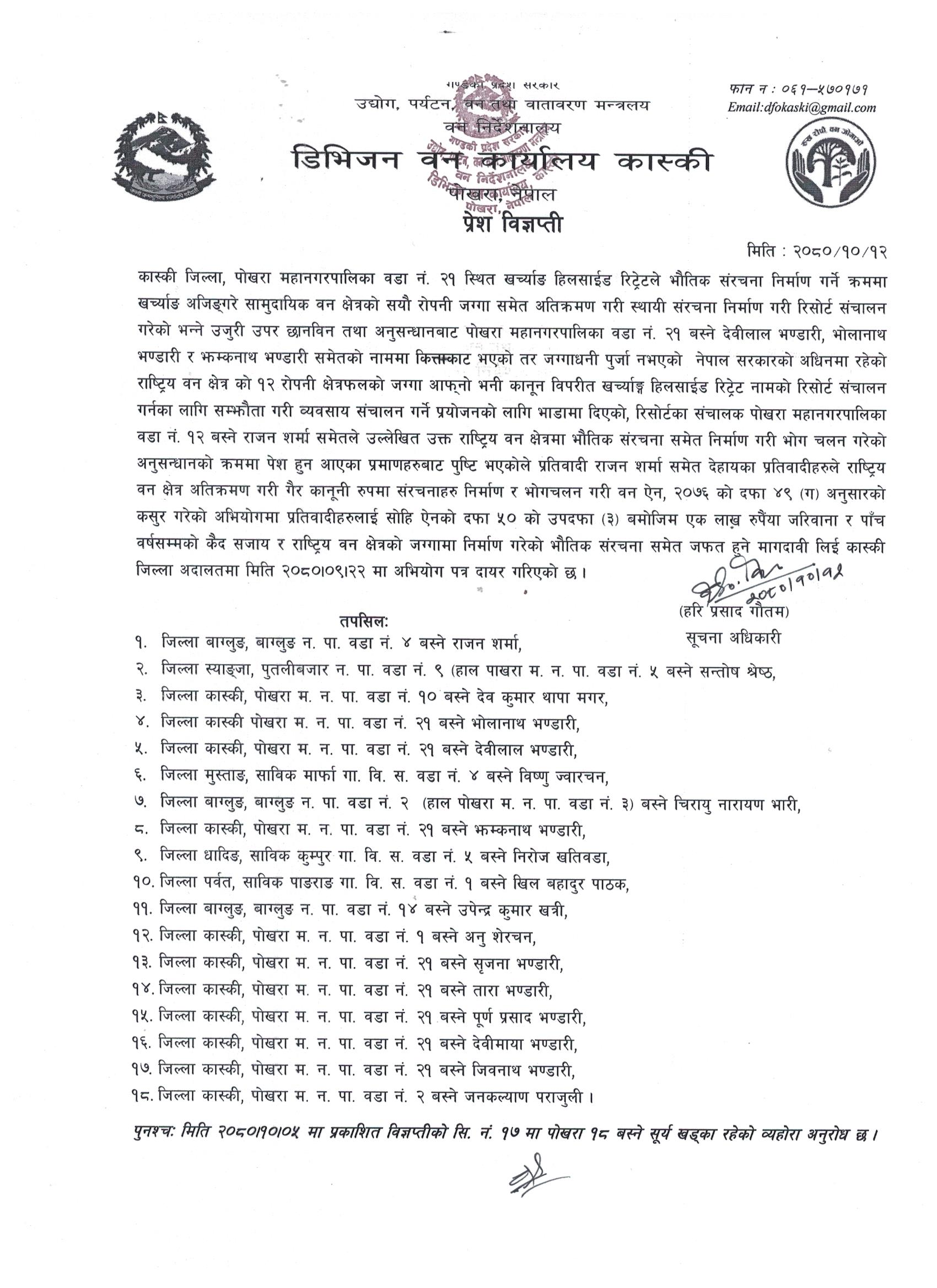 पोखरा २१ मा वन क्षेत्र अतिक्रमण गरी संरचना निर्माण सम्बन्धी प्रेश विज्ञप्ती